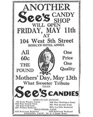 See moved to Los Angeles with his family and widowed mother, Mary See. There, at 135 Western Avenue North, he opened the first See's shop, selling Mary's delicious confections made from her own original recipes.