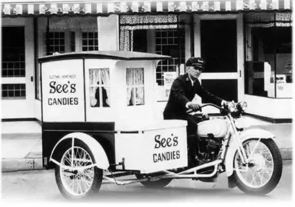 Motorcycle delivery service started in LA when Hugh Fry, a shipping clerk, would don a chauffeur's uniform and hop on a customized Harley to deliver See's around town. Customers included many Hollywood celebrities and movie stars!